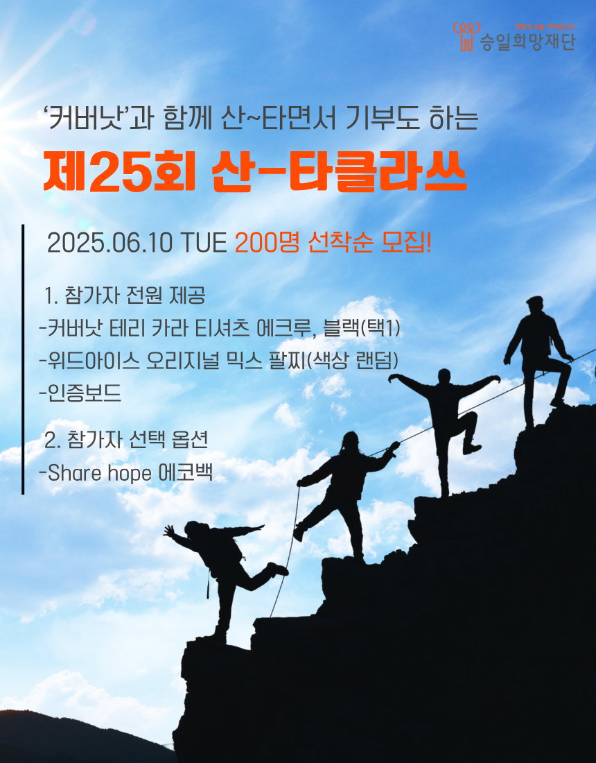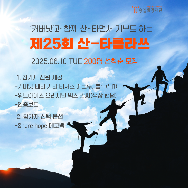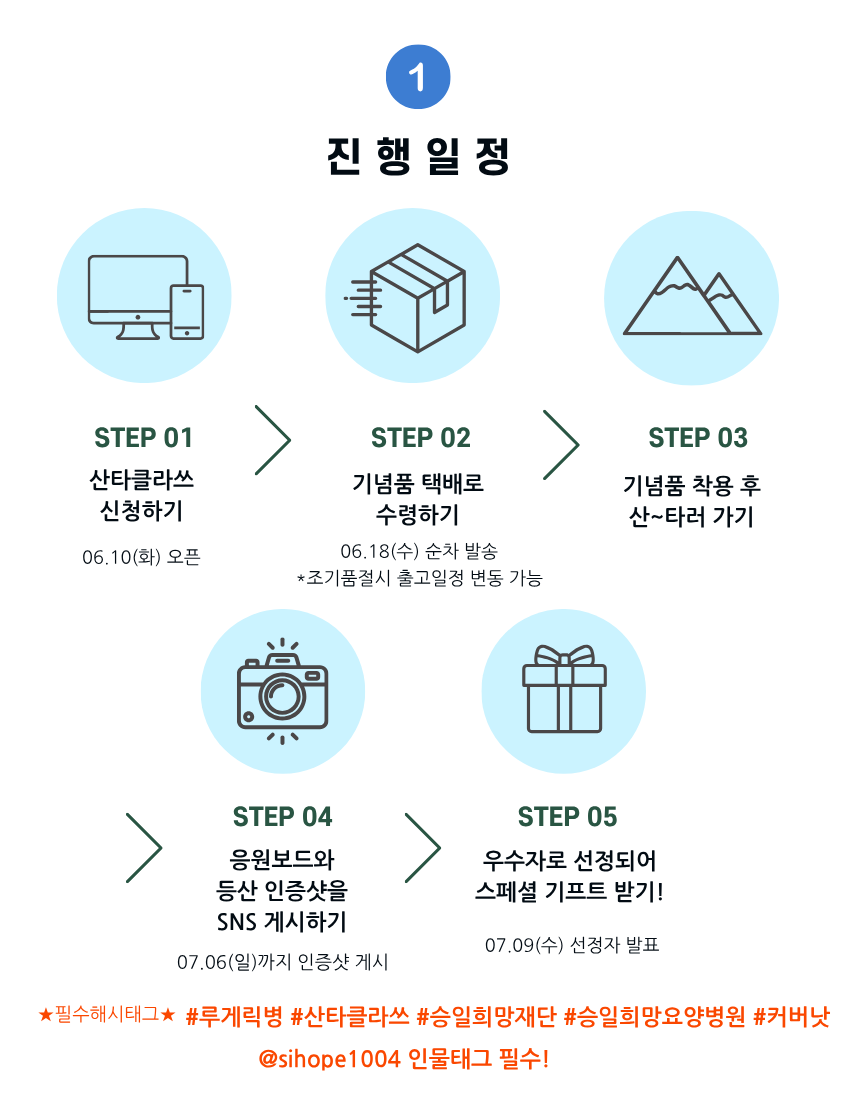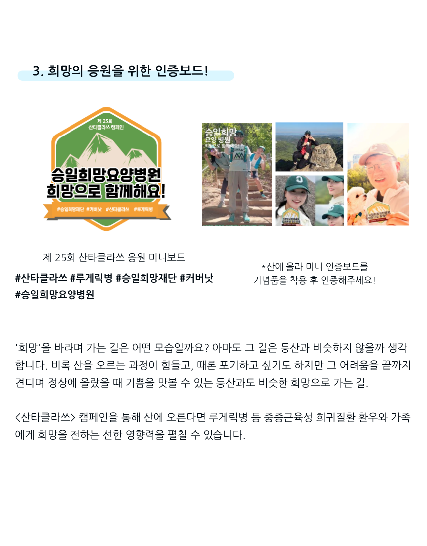 루게릭병 등 중증근육성 희귀질환 환우와 가족을 희망차게 응원하기 위한 즐거운 기부 캠페인으로 등산을 통해 희망을 선물할 수 있습니다. 산(Mountain)을 타는(타다, 오르다) '산~타'가 되어주세요!